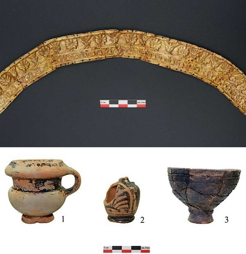 También se encontraron en la tumba más de 30 puntas de flecha de hierro, un gancho de hierro hecho con forma de pájaro, un arnés de caballo y un gancho para colgarlo, cuchillos de hierro, fragmentos de vasijas de cerámica y huesos de animales.